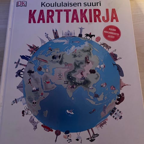 Karttakirja: Suuri Perhe Atlas. Jokaisesta maanosasta on ensin yleiskartta, jonka jälkeen yksityiskohtaiset kartat. Tieto-osasta löytyy valtioiden liput, pinta-alat, pääkaupungit ja viralliset kielet. Hyväkuntoinen. ISBN 951-0-24833-3. Kirjan koko: korkeus 34,5 cm, leveys 23,5 cm.