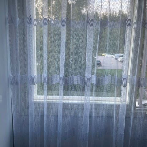 227×305 ruskeat verhot. Nipsuilla kiskoon kiinnitettävät. Painotaskut alareunassa. Kangas on läpikuultava.