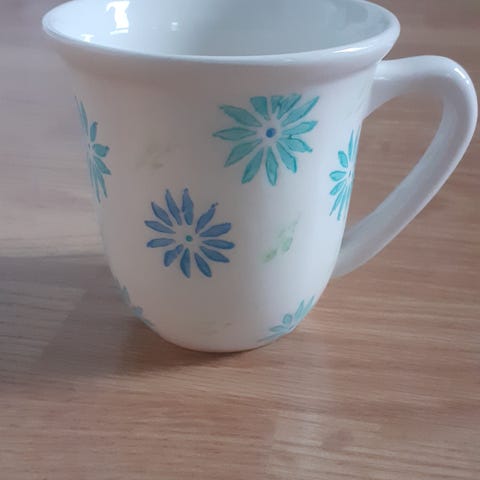 Indiskan vaaleansininen suurehko muki. Vetoisuus 4,5 dl. Vanhaa mallistoa mutta ehjä ja hyväkuntoinen.