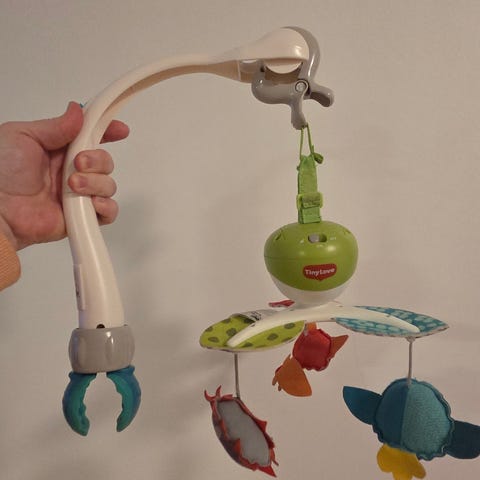 Vauvan pinnasänkyyn helposti kiinnitettävä mobileteline. Vaihtoehtona 2 lyhyempää tai 2 pitempää kiinnitysruuvia. Jollyroomista ostettu. Ovh. 29.90€