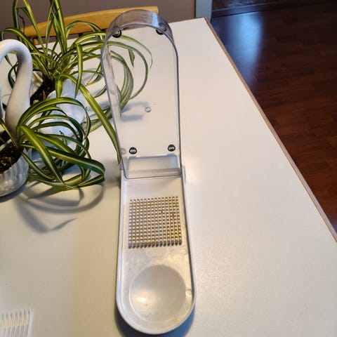 Ostetaan kuvissa näkyvän tyyppinen aaltoteräinen vihannesleikkuri / hedelmäleikkuri / taaperoveitsi. Myös vastaavanmallinen leikkuri sileällä terällä kiinnostaa.