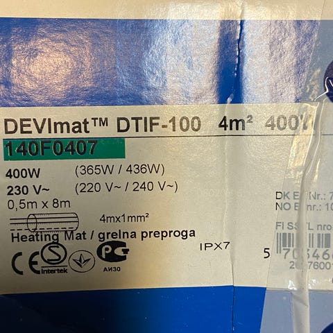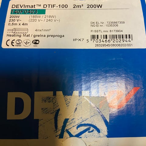 Käyttämätön DEVImat 50W 0,5mx0,7m lattialämmitysmatto alkuperäisessä pakkauksessa. Entisen sähkötarvikeliikkeen jäämistöstä.