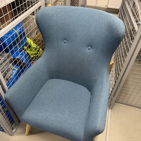 Nojatuoli, jossa korkea selkänoja ja irrotettava niskatyyny. Verhoiluna beige kangas. Runko, jalat ja käsinojat ovat puuta. Sopii esimerkiksi olohuoneeseen tai lukunurkkaukseen istuin- ja lepotuoliksi.