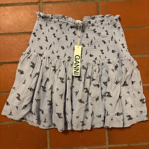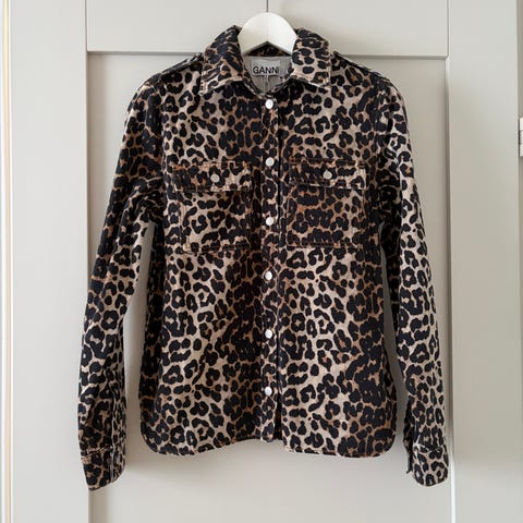 Ganni hame, koko 38. Ruskea leopardi-kuviointi. Materiaalina viskoosi. Vetoketju takana helpottamassa pukemista. Uusi ja käyttämätön.