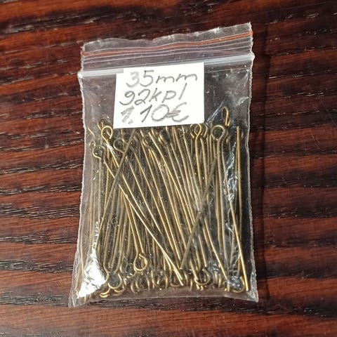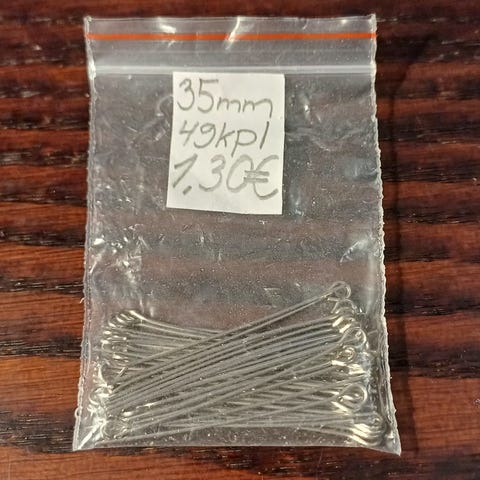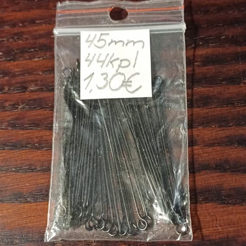 Korupiikkejä. Mustia. Rinkulapäisiä. Pit. 45mm. Pak. 0,7mm. 50kpl. 1,50€. Haku tai postitus kirjeenä 2,95€ kirjekuoren kanssa tai helposti kuoressa 3,75€.