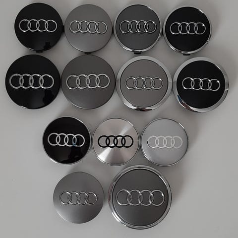 Keskiöiden pitäisi sopia Audi A-mallin (ei 1) vanteille, joissa on pulteille menevät urat. Myös VW/Skoda merkit ovat samaa kokoa. (Löytyy myös Q mallin harmaita)