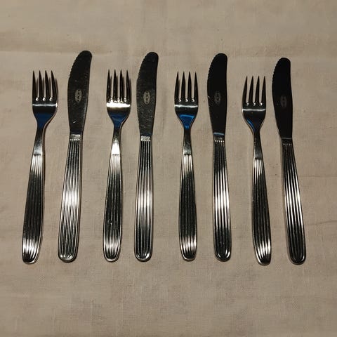 Hackman scandia ruokahaarukoita 10kpl. Osa vanhempia, lukee sorsakoski ja osassa Hackmanin leimat. Kaikki paljon käytettyjä, kunto näkyy kuvissa. Pituus 18cm.