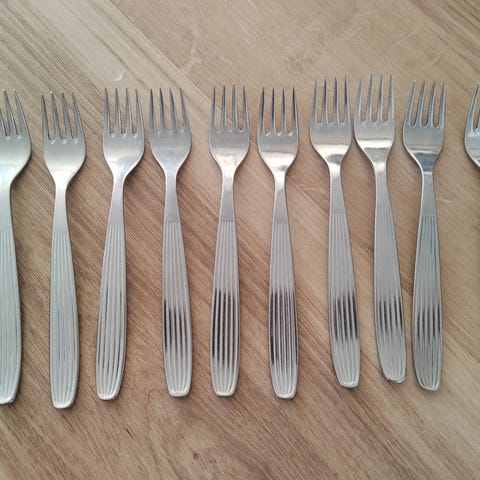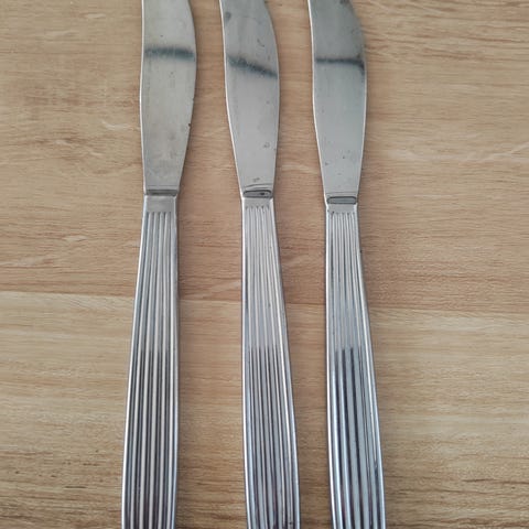 Hackman scandia veitset. Pituus 17,4cm. Paljon käytettyjä, kunto näkyy kuvissa. Toinen päästä hieman vääntynyt en tiedä saisiko oiottua.