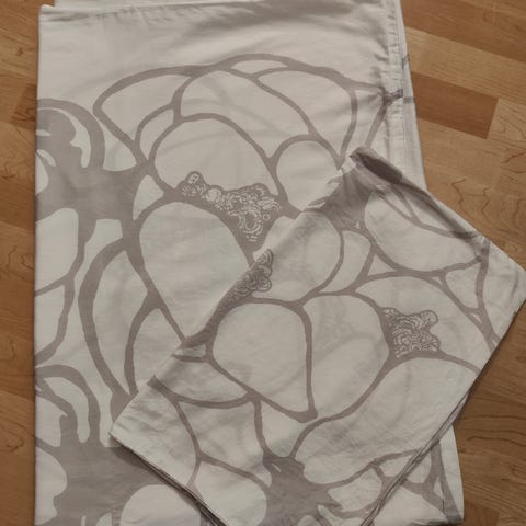 Käytetty, mutta siisti Vallilan Makeba-pussilakanasetti eli pussilakana ja tyynyliina. Vähän nukkaa. Juuri pestyt mutta ei silitetty. Taustaväri valkoinen ja kuvio beige. Pesulaput leikattu irti.