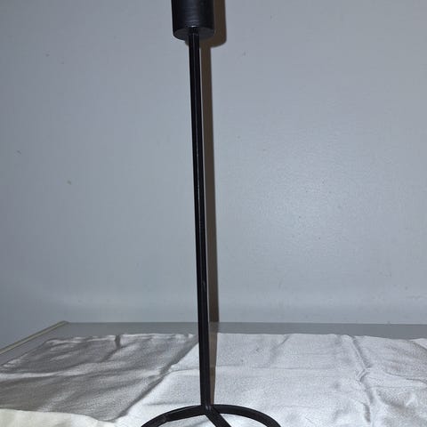 Näyttävä metallinen kynttilänjalka kolmelle kynttilälle. Musta mattapintainen. Korkeus: 16cm, kolmion sivut n. 15cm. Erittäin hyvässä kunnossa. Nouto Kuusankoski myös lähetys onnistuu.
