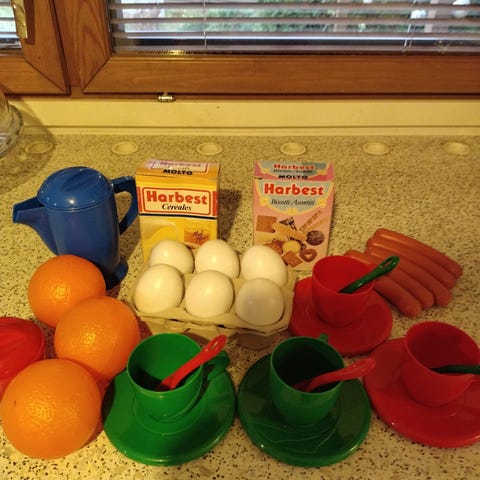 Seuraavalle leikkijälle posliinisia astioita sekä puisia leikkiruokia. Kaikki myydään kerralla.