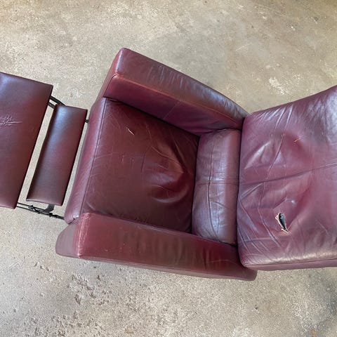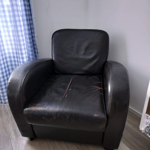 Laadukkaat, kestävät tuolit. Verhoilu on lujaa, paksua nahkaa. Nahassa jotakin luonnollista kulumaa. Musta teräsrunko. Maali kulunut pohjista siitä kohtaa, mikä lattiaa vasten, nuo ei siis näy.
