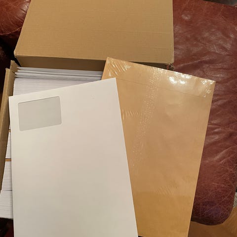 Myynnissä vaalean ruskeita kirjekuoria tarrasulkijalla A4 papereille