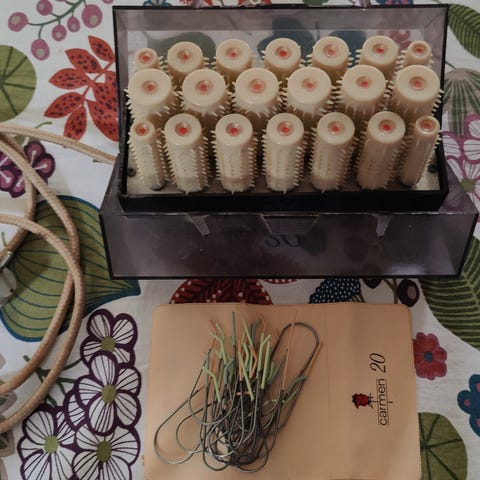 Kangaspussukka ja muovikupu nähnyt aikaa, mutta itse rullat, eli "itse tavara" erinomaisessa kunnossa 💜