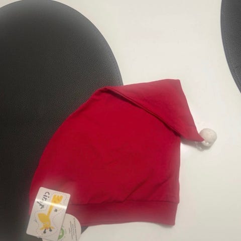 Melike merkkinen tonttulakki rusetilla, koko XS (py 40-42), mutta meni joustavuuden vuoksi isommallakin. Siisti kunto. Uutena meille tullut ja pari joulua ollut käytössä. Hajusteellinen pesuaine ja entinen koiratalous😊