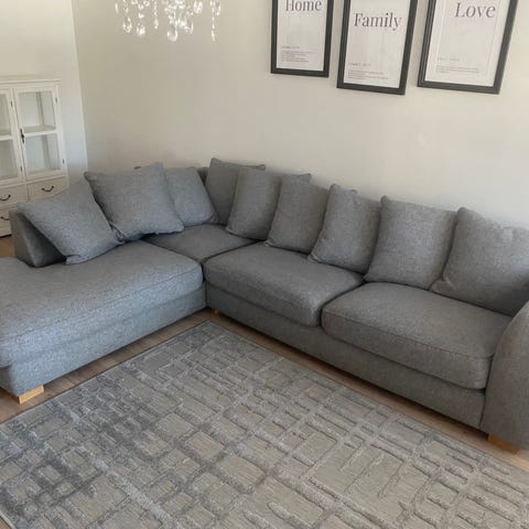 Myydään siisti ja hyväkuntoinen beige kulmasohva divaanilla.