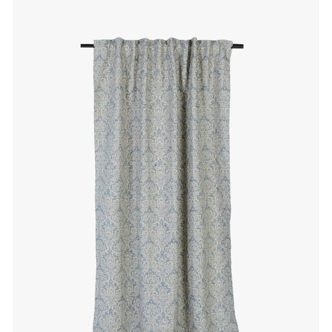 Ylhäällä aaltolaskosnauha + verhokoukut. Alhaalla verhopainot. Ovh 94 €/m. Verho on ollut sisustusliikkeen malliverhona. Kangas soveltuu myös verhoiluun.