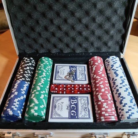 Korttipakat ja chipit sineteissään! Itse salkun päällysmuovi rikkoutunut mutta muuten siisti paketti. Nopat puuttuvat!