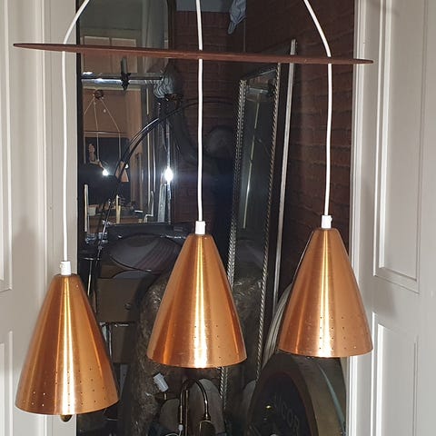 Myydään tyylikäs ARIS-kattovalaisin, jossa kaunis kuparirunko, kolme opaalilasikupua sekä teak-puuyksityiskohta alaosassa. Ajaton 60–70-luvun henkeä huokuva malli, joka sopii upeasti mid century / retro -sisustukseen.