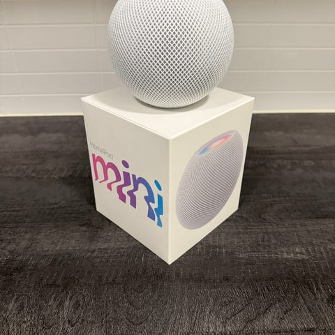 Apple HomePod mini älykaiutin valkoisena. Pöydälle sijoitettava, pyöreärakenteinen kaiutin, jossa on integroitu virtuaaliavustaja ja kosketuspinta yläosassa. Soveltuu käytettäväksi musiikin kuunteluun, äänikomentojen ohjaukseen sekä yhteensopivien älylaitteiden hallintaan Apple-ekosysteemissä. Myyntikuvassa näkyvät alkuperäiset myyntipakkaukset.