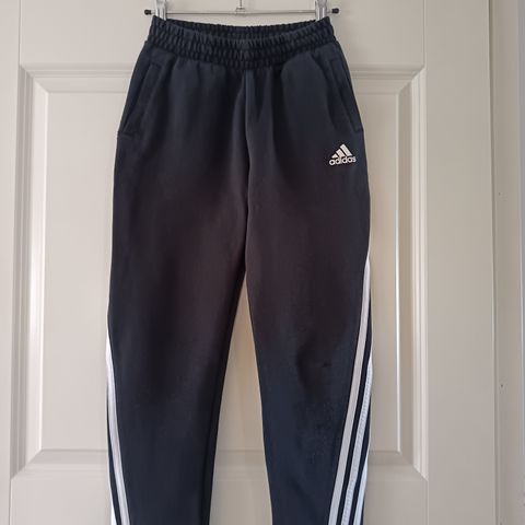 Adidas lasten verkkarit, unisex-malli. Koko 140 cm (noin 9–10-vuotiaille). Väri musta, sivuilla kontrastiraidat. Joustava vyötärö kiristysnyörillä ja resorit lahkeensuissa. Sopivat arki- ja urheilukäyttöön sekä sisä- ja ulkoliikuntaan. Hyvässä käytetyssä kunnossa. Takassauma pepusta on hieman löystynyt, mutta helppo korjata, jos katsoo tarpeelliseksi.