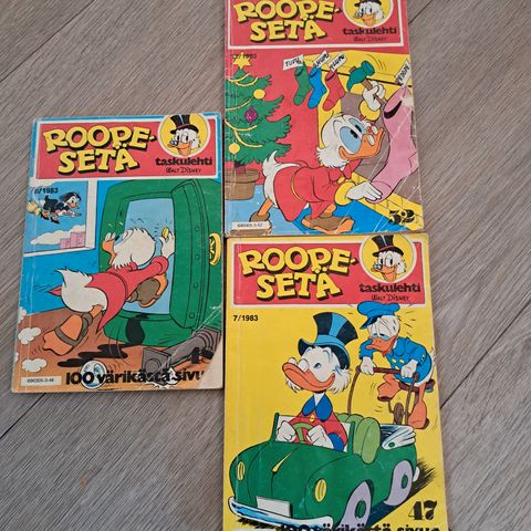27 kpl Roope - setä -sarjakuvakirjaa ( ei kansissa mainittuja julisteita tms. vain kirjat ) VUODELTA 1999 numerot: 241, 242, 243 VUODELTA 2000 numerot: 245, 247, 248, 249, 250, 252, 255, 256 VUODELTA 2001 numerot: 258, 260, 261, 262, 264, 265, 266, 268 VUODELTA 2002 numerot: 274, 275, 276, 277, 278 VUODELTA 2003 numerot: 282, 284, 286. Valitsin kunnoksi hyvä, koska kirjojen sivut siistit ja kannetkin hyvät, vain kansien kapeassa osassa vähän kulumaa tms. Säilytetty hyvin, imuroitu yms. Nouto Viitasaaren keskustasta, käteismaksu noudettaessa. EN LÄHETÄ POSTISSA.