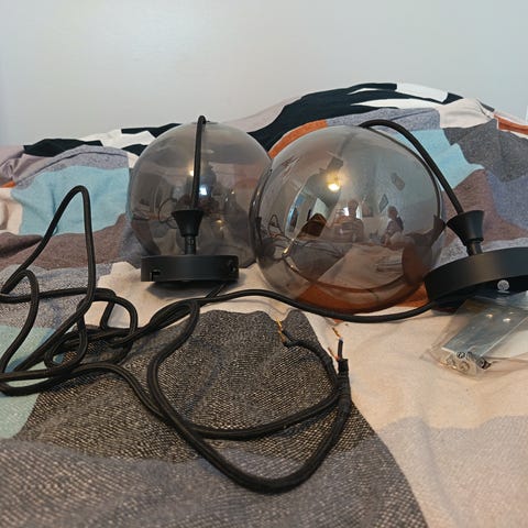 Kattolamppu kolmella roikkuvalla koriste hehkulla. Hehkut saa mukaan! Ostettu uutena jyskistä elokuussa ja muistaakseni ovh hinta oli 60 + 15€ 3kpl isot koristehehkut.