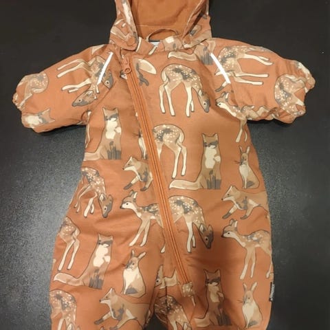 Jonathan vauvan haalari, koko 50. Unisex-mallinen haalari, jossa kirjava kuosi ja eläinaiheinen printti. Materiaalina polyesteri. Haalarissa on huppu, jossa tekoturkisreunus, sekä etupuolella kulkeva vetoketju helpottamassa pukemista. Kädet jalat saa hupun sisään. Käytetty vain vaunukopassa. Erittäin hyvässä kunnossa.