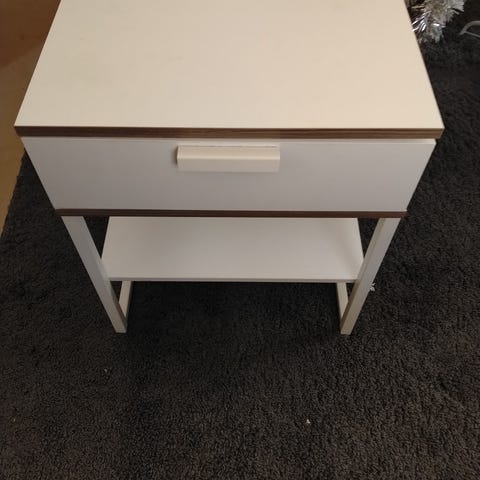 Pieni valkoinen, neliskanttinen yöpöytä etsii uutta kotia. Toimii myös kukkapöytänä tai vastaavana. On kulumaa kulmissa ja pientä tummentumaa jaloissa, mutta isoimmat viirut lähtee kuuraamalla pois. Myös uusi maalipinta piristää ilmettä. Kansi on irtonainen (ks. viimeinen kuva).