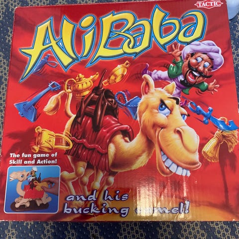 Ali Baba lautapeli, jossa muovinen kamelihahmo jalustalla sekä useita muovisia peliosia ja kortteja. Peli sisältää kamelin selkään kiinnitettäviä muovisia esineitä ja muita pieniä osia. Soveltuu lautapeliksi useammalle pelaajalle, tarkemmat säännöt ja ikäsuositus löytyvät pelin ohjeista ja pakkauksesta.