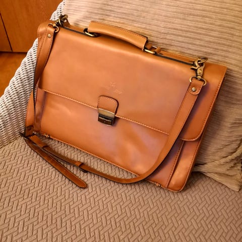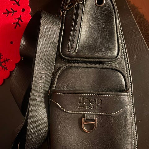 Jeep olkalaukku tekonahkaa, ruskea. Laukussa on kantokahvat sekä säädettävä ja irrotettava olkahihna. Edessä on vetoketjutasku ja pieni lisätasku, takana vetoketjutasku. Sisäpuolella on useita lokeroita ja taskuja, mukaan lukien pehmustettu osio esimerkiksi kannettavalle tietokoneelle tai tabletille sekä pienemmät taskut pientavaroille. Materiaali on ruskeaa tekonahkaa ja sisävuori vaaleaa kangasta. 14 tuuman kone mahtuu.