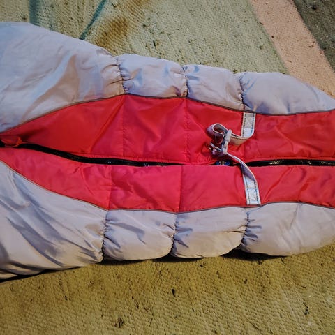Siisti toppatakki koiralle. Lisätty klipsi mikä pitää paremmin kiinni kuin tarra. Selän pituus 60cm + kaula osuus 10cm. Ympärys lyhimmillään tarran kanssa 80cm. Tarkempia mittoja ja kuvia kysymällä.