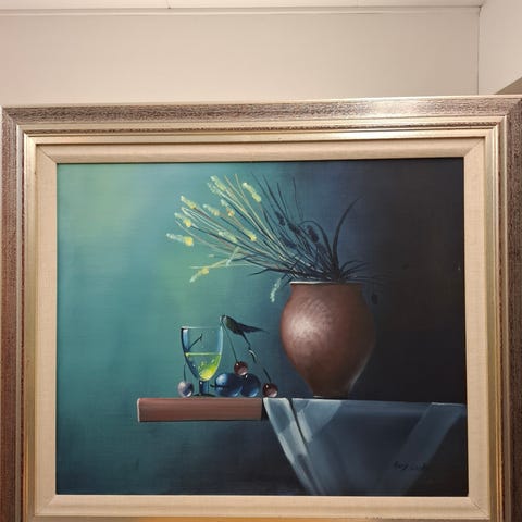 Kuvataiteilija Olavi Laineen öljyvärimaalaus. Taulu on kehysten päältä mitattuna korkeudeltaan noin 71 cm ja leveydeltään noin 89 cm.