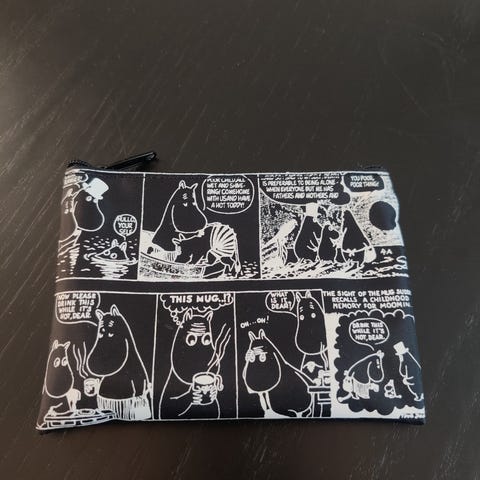 Moomin kangaslompakko naisille. Lompakossa on värikäs Muumi-aiheinen kuosi ja vetoketjusuljenta. Sisällä on useita lokeroita korteille ja seteleille. Materiaalina on kangas, ja lompakossa on kiinnitettynä rannelenkki helpompaa kantamista varten.