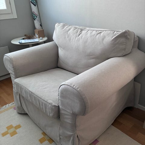 Huom. Olen ostanut nojatuolin rungon käytettynä ja se on ollut aiemmin koirataloudessa. Päälliset ovat juuri Ikeasta ostetut, olleet n. 1kk käytössä. Valkoisen koristetyynyn (erillinen päällinen ja sisätyyny) saa halutessaan kaupan päälle.