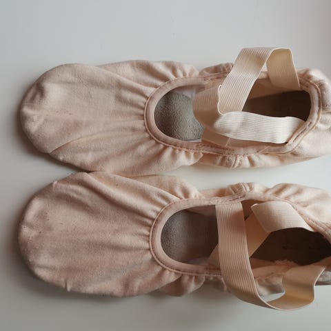 Siisti vaatekerta seuraavalle tanssijalle. Tossujen pohjassa hieman roskaa ja tummentumaa, ei ole rapsuteltu vielä irti eikä pesty.