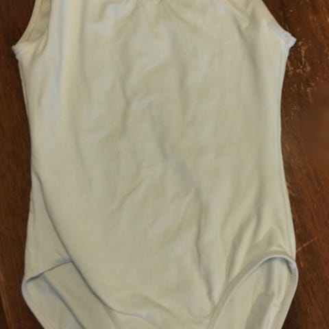 Vaaleansininen puku Bloch-merkkinen, kokomerkintä 14. Sopii n. 140-150-senttiselle käyttäjälle. Hameen kokomerkintä 12-14.