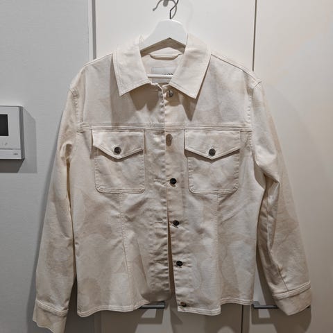 Marimekko naisten takki, koko M. Takki on puuvillaa ja siinä on suuri, graafinen kirjava kuosi vaalealla ja tummalla sävyllä. Edessä on vetoketju- ja painonappikiinnitys sekä etutaskut. Takki soveltuu arki- ja vapaa-ajan käyttöön. Huppu ja vuoriton rakenne tekevät siitä kevyen päällitakin leudompaan säähän.