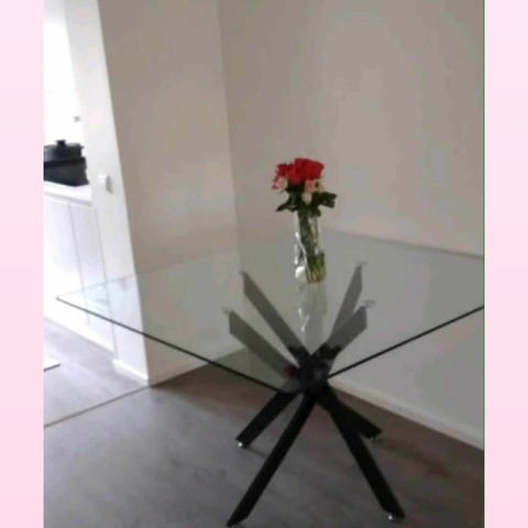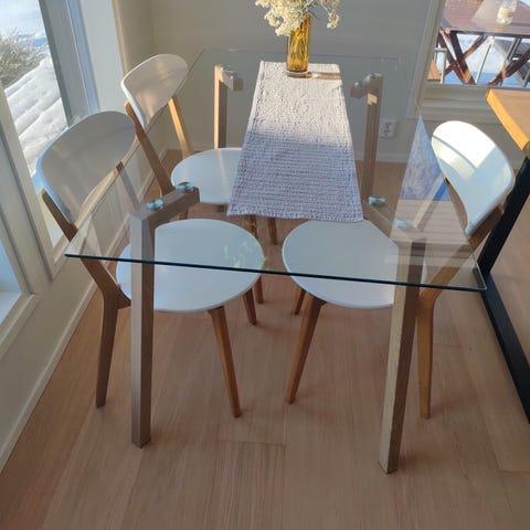 Keittiön lasinen pöytä+4 kpl tuolia