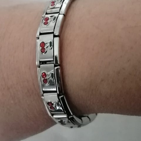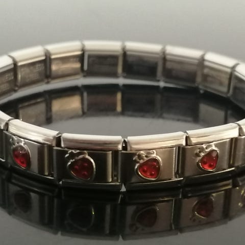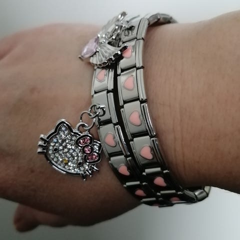 Rannekoru, 19 palaa. Kestävä, ruostumatonta terästä. Uusi, joten sopii myös lahjaksi. Koru on venyvä, se on helppo sujauttaa ranteeseen, sopii lapsille ja aikuisille. siitä saa helposti pienennettyä ja suurennettua paloja lisäämällä tai poistamalla. Yhteensopiva Casa D'oro, nomination, charms yms. palakorujen kanssa. Paloja 18 vaaleanpunaista sydänpalaa ja Hello Kitty pala.