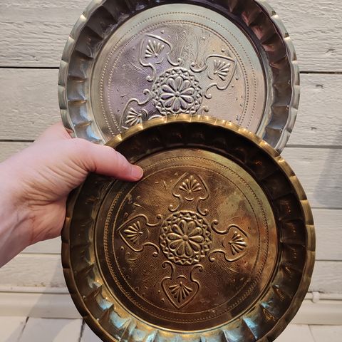 Koristeellinen messinkilautasetti, joka koostuu kuudesta erikokoisesta ja -muotoisesta lautasesta. Jokaisessa lautasessa on yksityiskohtaisia kaiverruksia, jotka tuovat esiin käsityön taidon ja perinteen. Setti on valmistettu messingistä, mikä antaa sille lämpimän ja arvokkaan ilmeen. Lautasissa on näkyvissä ajan patinaa ja kulumaa, mikä lisää niiden vintage-luonnetta. Joissakin lautasissa on pieniä naarmuja ja värjäytymiä, mutta ne eivät vähennä esineiden esteettistä arvoa.