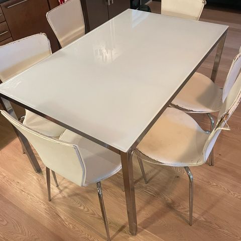 Tyylikäs Ikea Glivarp malliston moderni ruokapöytä, jossa on lasinen pöytälevy ja metalliset jalat. Pöytä on laajennettavissa keskeltä mekanismilla, mikä tekee siitä käytännöllisen valinnan erilaisiin tilaisuuksiin ja tiloihin. Lasipinta tuo keveyttä ja avaruutta huoneeseen, kun taas metallirunko antaa sille tukevuutta ja kestävyyttä. Käytön jälkiä pöydässä ja lisäksi pintalikaa lasin ja rungon väleissä, joka voi vaatia puhdistusta.