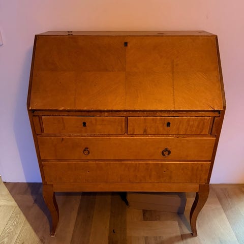 Tyylikäs chippendale-tyylinen kirjoituslipasto. Lipastossa on koristeelliset jalat ja hienot metallivetimet, jotka korostavat sen klassista ilmettä. Sisäpuolella on useita pieniä lokeroita ja laatikoita, jotka tarjoavat runsaasti säilytystilaa papereille ja muille tarvikkeille.