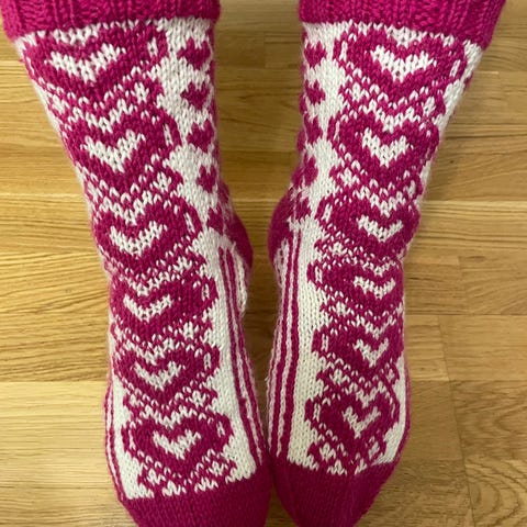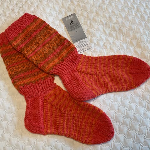 Novita 7-veljestä kudotut sydänsukat. Postitus kirjeenä 5,50 tai toridiili.