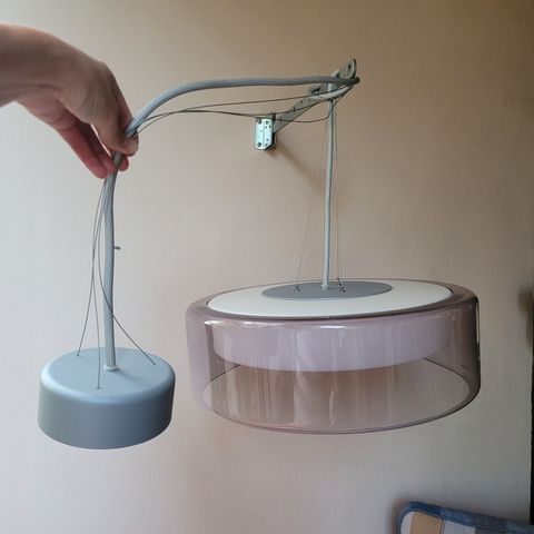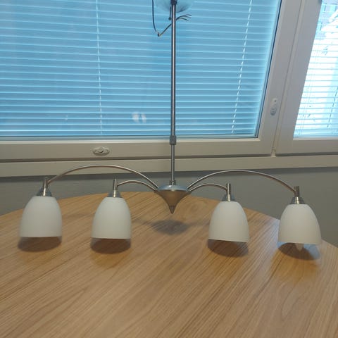 Myydään pyöreä, rosterinen, moderni riippuvalaisin. Halkaisija 35 cm. Korkeus säädettävissä, kattokoukkukiinnitys, pistorasia, 3 valon lähdettä.