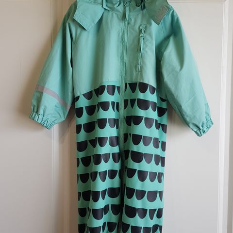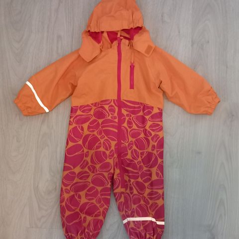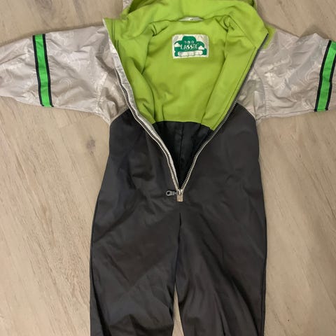 Hyväkuntoinen puolikurahaalari ohuella vanulla, sopiva keväälle. Jalkalenksut kätki, mutta muuten en moitteita havainnut. Haarat, polvet ja peppu ehjät. Koko reilu 86, vastaa ehkä enemmän kokoa 92. Mahtui ilman välivaatteita vielä 93 cm pitkälle.