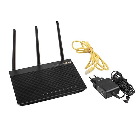 Huippuluokan reitin monipuolisella Asuswrt-Merlin - firmiksellä. Keskellä näkyvä huulitarra liimattu jälkikäteen ja irrotettavissa. Reitin palautettu tehdasasetuksille. Kauppaan kuuluu pelkkä reititin ja virtamuuntaja, ei ohjeistarvikkeita.