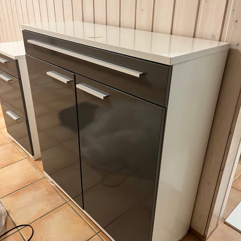 Myydään kylpyhuoneessa ollut korkea kaappi. Sivulla aukko.