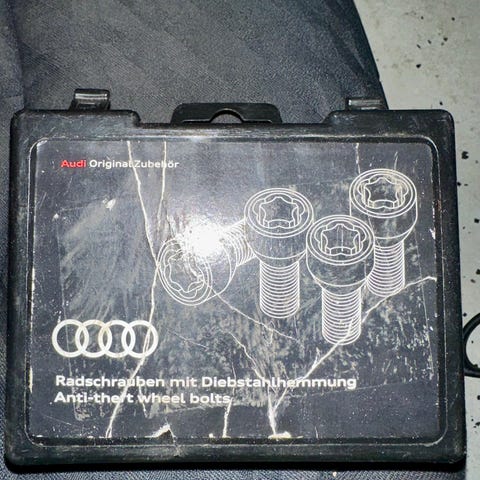 Audi pyöränlukituspulttisarja. Sarja sisältää neljä lukituspulttia ja avainholkin. Tarkoitettu vanteiden lukitsemiseen Audi-autoissa. Alkuperäinen Audi-tarvike, toimitetaan muovikotelossa, jossa käyttöohjeet useilla kielillä. Sarjan varaosanumero näkyy pakkauksessa.