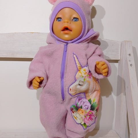 BB 43cm fleece takki, housut ja hattu. Housuissa on jalkaterät. Tarrakiinnitys. Edessä kukkanapit vain koristeena.